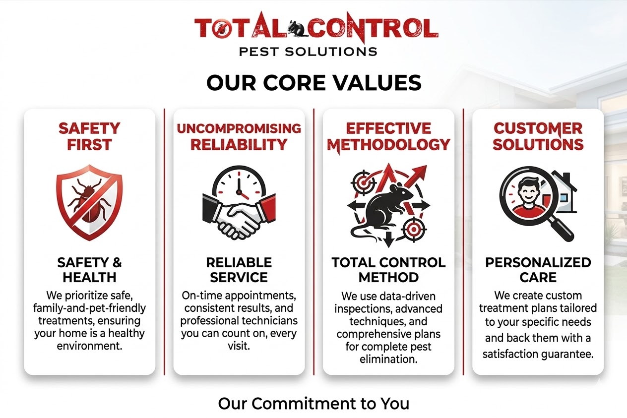 At Total Control Pest Solutions, we believe pest control should be simple, effective, and stress-free. That's why everything we do is built on our core foundation - Precision, Protection, and Peace of Mind. We specialize in delivering targeted pest solutions that don't just treat the problem - they eliminate it at the source. With a sharp eye for detail and a commitment to doing the job right the first time, our approach ensures your home or business stays protected without unnecessary treatments or inflated costs.